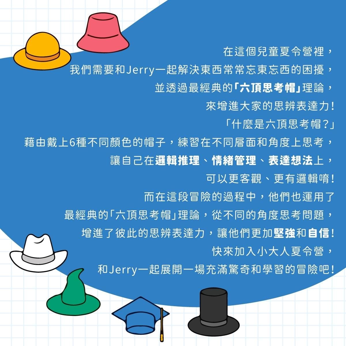 讓孩子們透過經典的「六頂思考帽」,探索六種不同的思考模式,