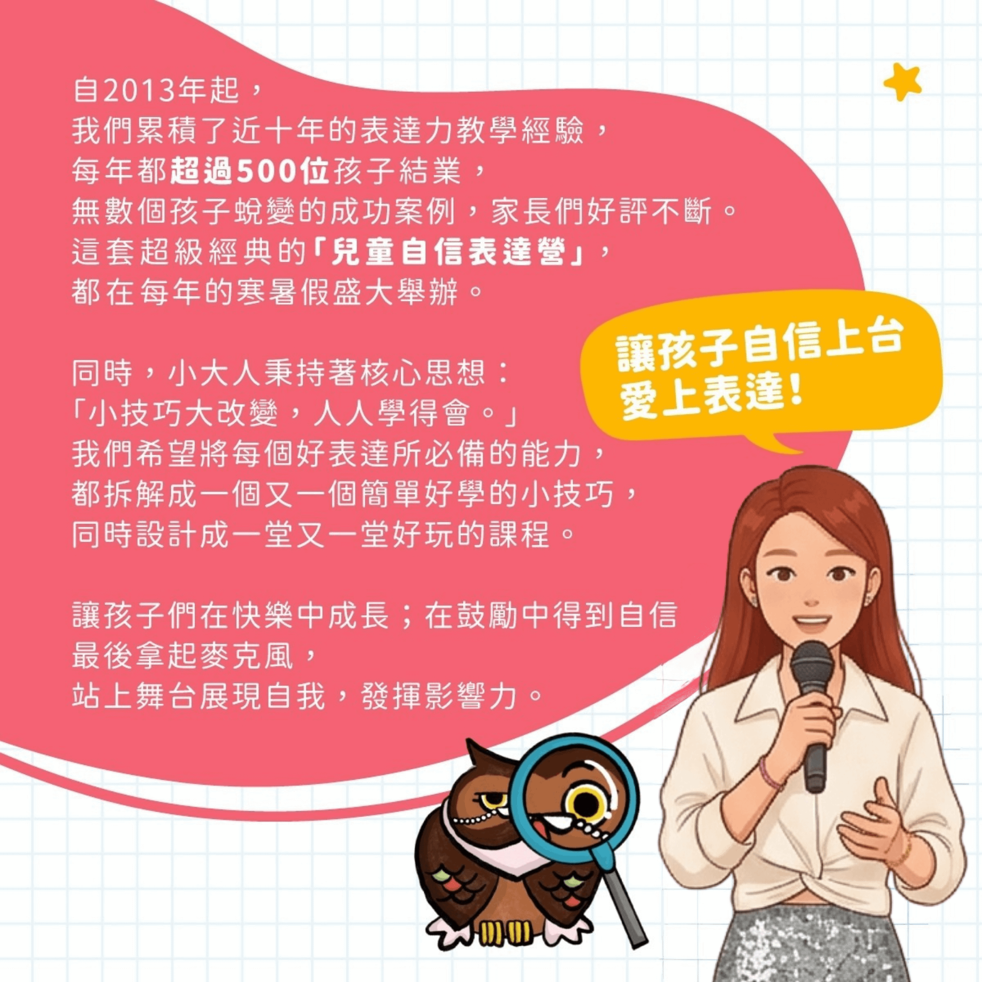 歡迎來到小大人表達學院夏令營,我們深知表達力、邏輯思辨和咬字發音對孩子的成長至關重要。