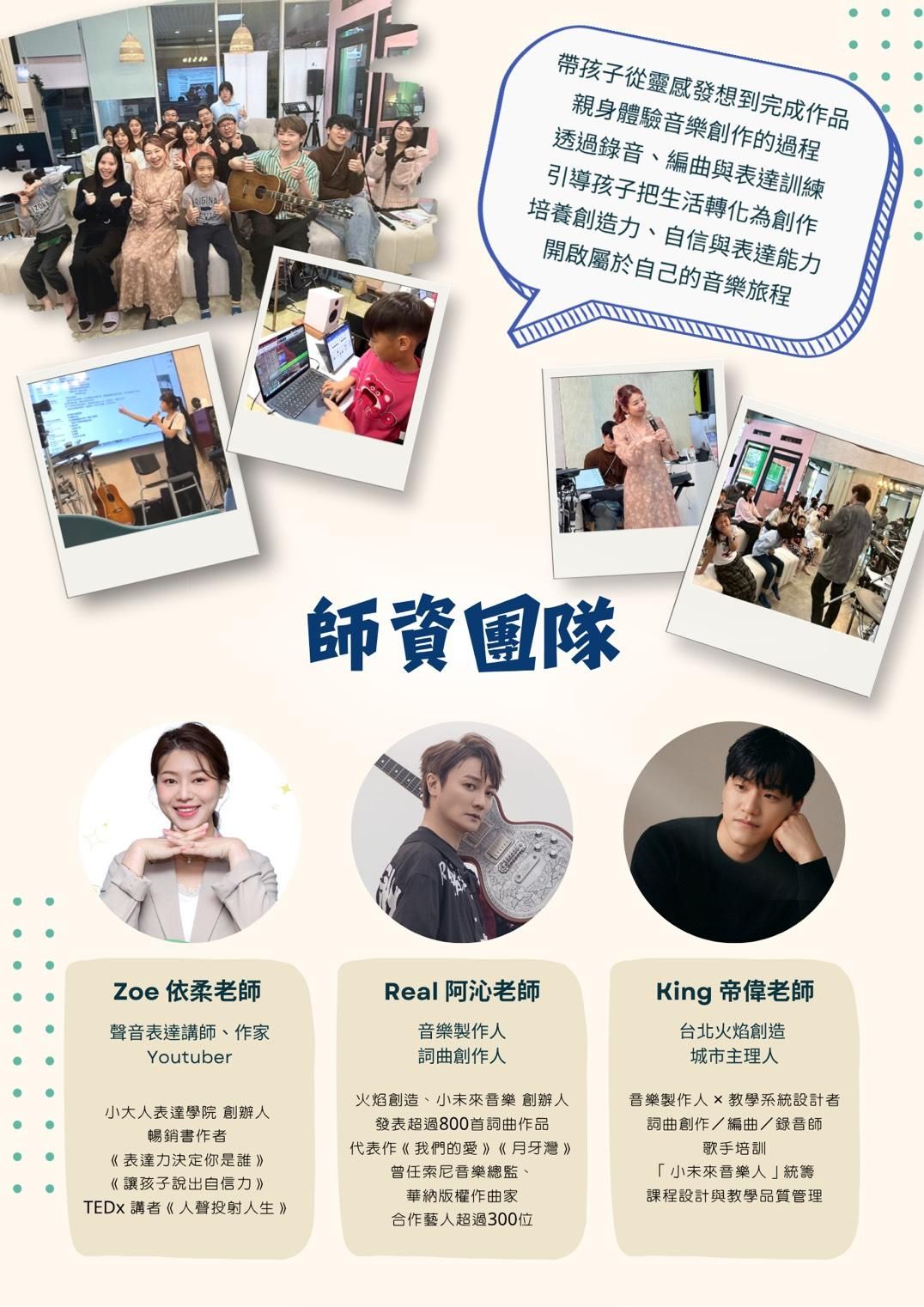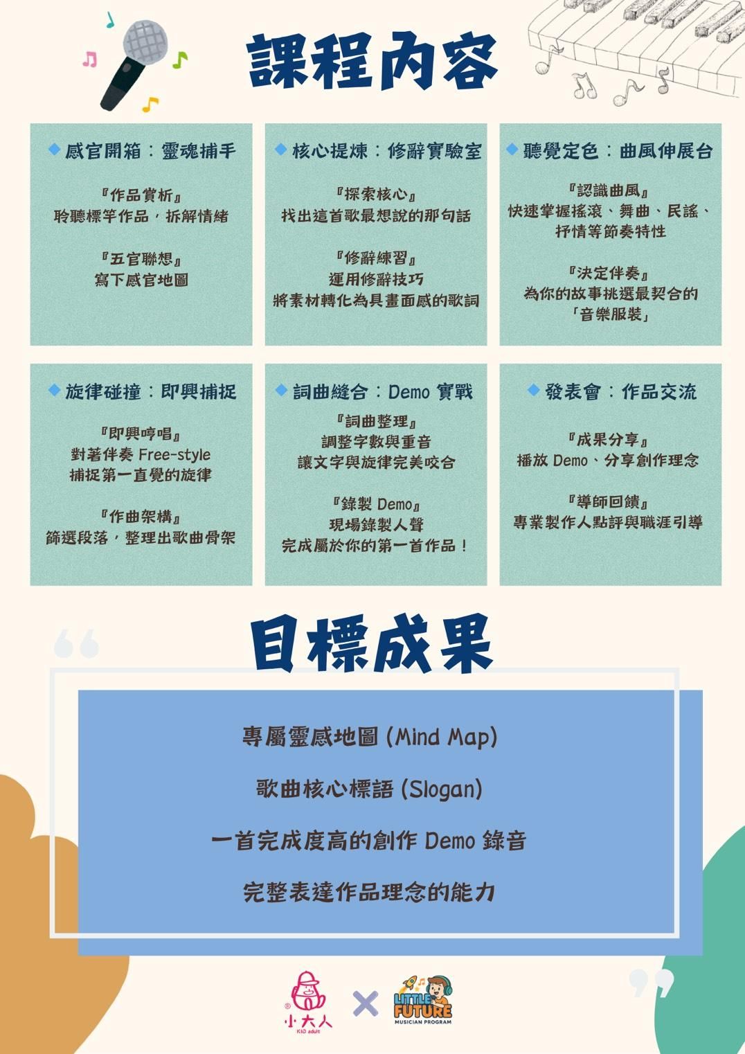 專業音樂製作人將引領孩子詞曲即興創作,進而完成專屬自己的歌曲。